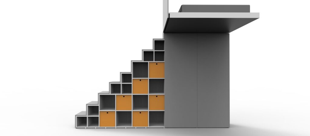 Ci-dessous, une mezzanine pour chambre d’enfant, accompagnée de ce casiers de rangement et d’un dressing, le tout réalisé à l’aide des logiciels AutoCad et Sketchup, ainsi que KeyShot pour les rendus.