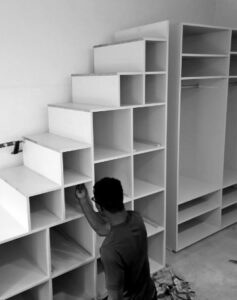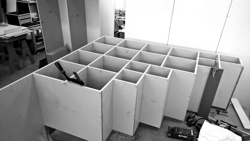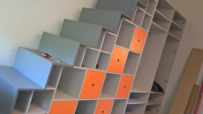 Comme tout travail sur terrain, il y a toujours des adaptations à anticiper lors de la conception du projet, telles que la mise à niveau, les alignements des façades, la fixation et le réglage des portes, et enfin l’intégration des tiroirs de rangement orange à l’emplacement qui leur était destiné.