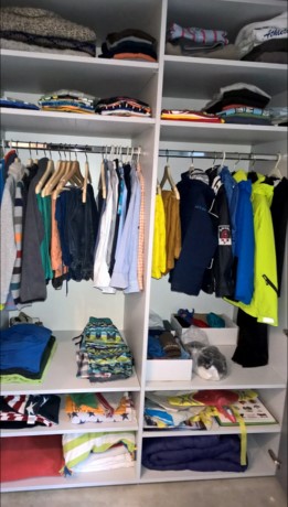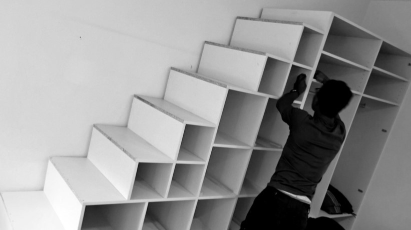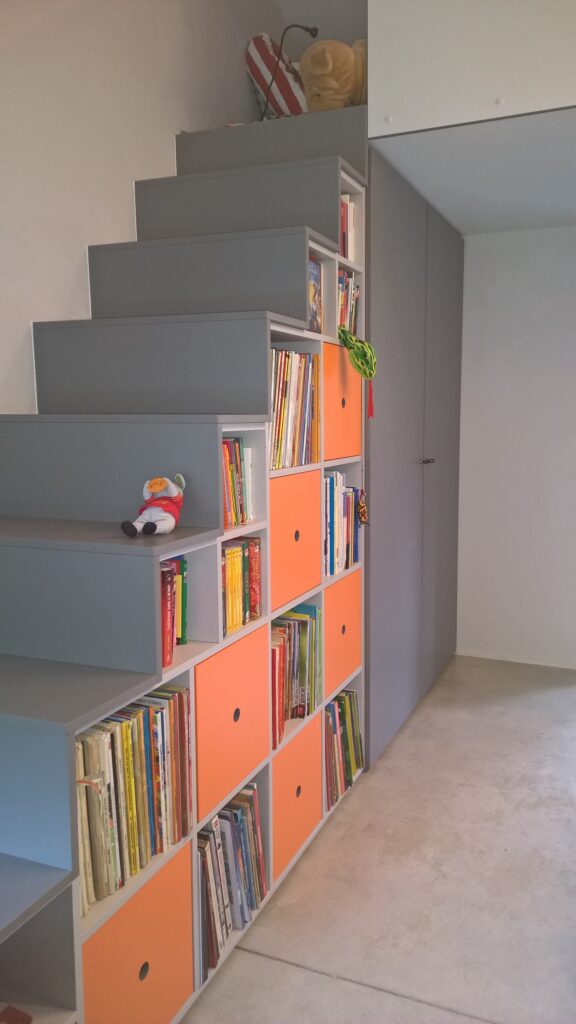 Les demandes du client ont été prises en compte : des espaces disponibles ont été aménagés sur le côté du meuble escalier pour y ranger des livres, et dans le prolongement, du vestimentaire dans un dressing comportant plusieurs étagères adaptées.
